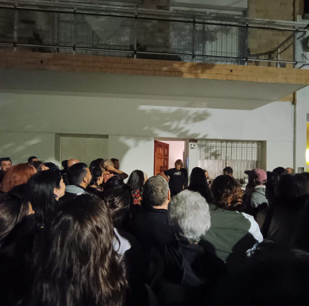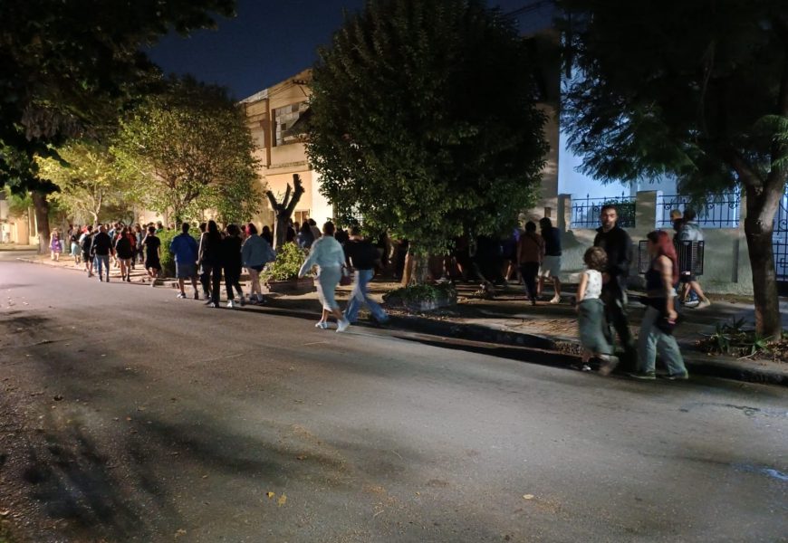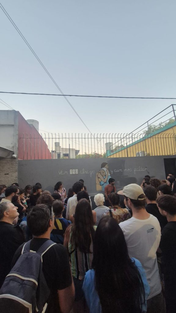 Al terminar el recorrido, nos tomamos un momento para dar un cierre. Tomaron la palabra Lucía, Ramón y Nacho, quienes fueron los grandes artífices de ese encuentro. De esas palabras surgieron preguntas sobre cómo caminar por las calles nos permitió encontrarnos entre nosotros y con las personas del barrio que podían contarnos historias. Hubo algo de la vuelta a lo analógico, del boca en boca, de seguir eligiendo rearmar la historia que nos quisieron arrebatar. Y al final de todo, la arenga: el 24 llenemos la plaza, que estos gorilas nos quieren tristes, pero nosotrxs sabemos bailar la calle. Y así fue.