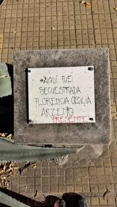Frente al hospital, donde estábamos paradxs, hay un pequeño bloque de cemento con una placa desgastada. Lucía nos invita a que dejemos registro de lo que sucedió en ese lugar. Una compañera dejó escrito: Aquí fue secuestrada Florencia Cecilia Arzeno. Presente.