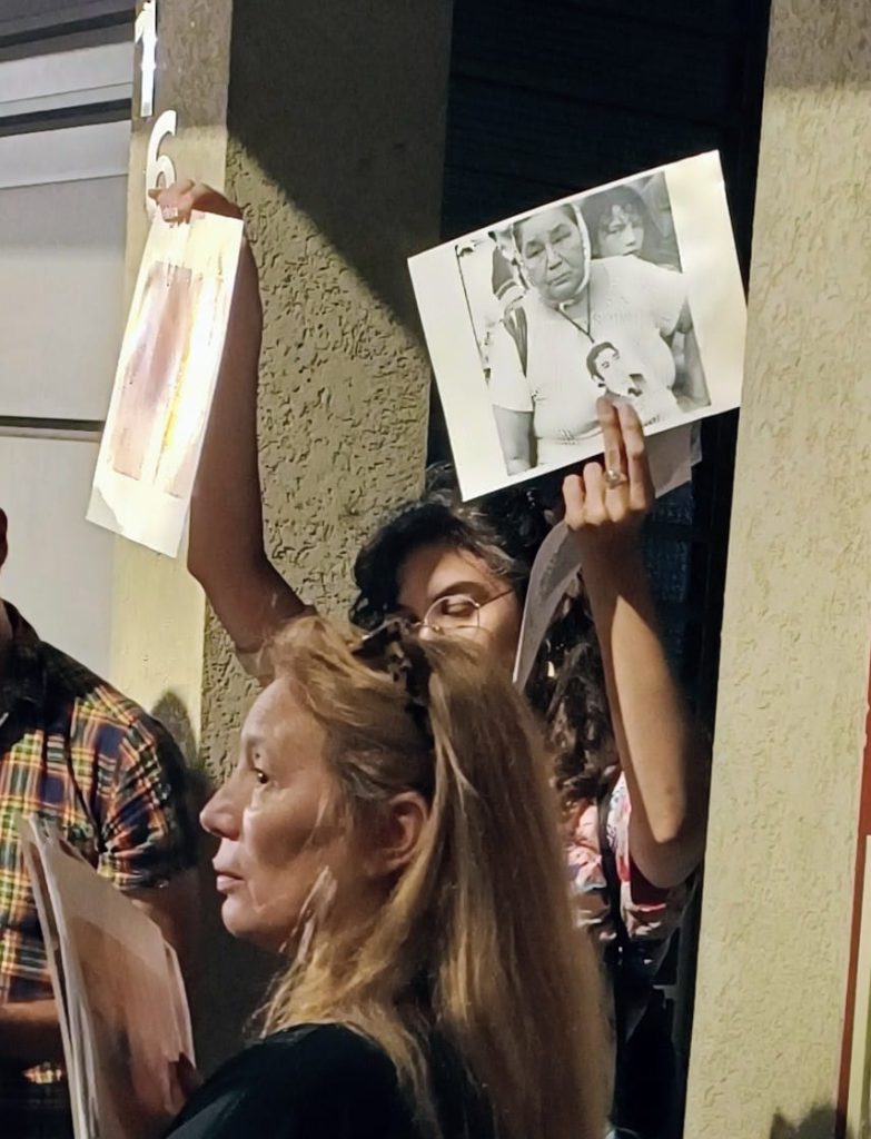 Lucía termina de contar la historia de Emiliano y la sensación fue de no tener espacio entre el pecho y la espalda. Un sistema de robo de bebés donde obligaban a parir a las compañeras y entregaban sus hijxs a familias de militares podía tener un costado más cruel aún, el desprecio de la vida de Emiliano por tener una discapacidad. Una vida que para ellos no merecía ni ser robada. Lo abandonaron a que muera. Antes de seguir, Lucía nos recordó que estábamos ahí nombrándolo para marcar bien fuerte la diferencia, mientras que para ellos hay vidas que valen y otras que no, acá queremos pensar un mundo donde todas las vidas valen.